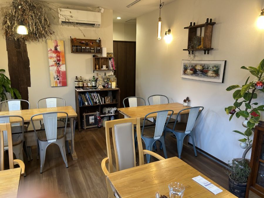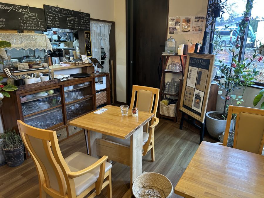軽井沢町の国道18号線バイパスにある「塩沢」の信号を「軽井沢タリアセン」に向かって曲がったところのすぐ右手に「CLOUD Nine KARUIZAWA」さんがあります。シックで落ち着いた雰囲気の建物を中に入ると、清潔感ある店内には4つのテーブル12席があります。テラス席は犬もOK! 12席あります。