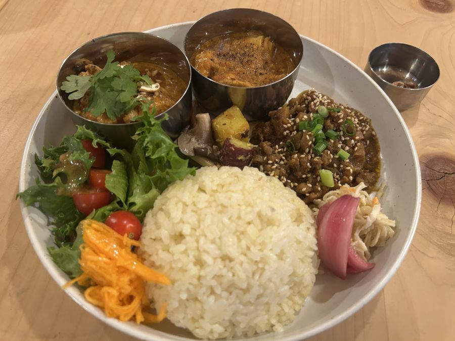 定番だというチキンカレーは、さわやかスッキリした味わいの中に旨みが広がり、どこか懐かしい甘みを感じます。店主の本間江里さんによると、基本的に信州のお米に合うものを作っているので、調味料は味噌とか醤油とか日本の調味料を使ったり、お出汁を使ったりして、食べやすくアレンジしているそうです。野菜は地元のもので、スパイスは10種類以上です。