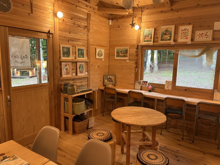 お店は、森の中の静かな環境にあります。そこでの時間をゆったり味わってもらいたいと本間さんは言います。食べて味わう、目で味わう。五感で味わう。そんなお店は、お店で初めて会ったお客さん同士が仲良くなることが多いそうです。お店の横にはギャラリーがあり、器、雑貨、アクセサリー、かごなどが展示されています。店内ではミニコンサートを開催することもあり、森の中のアートなスペースになっています。