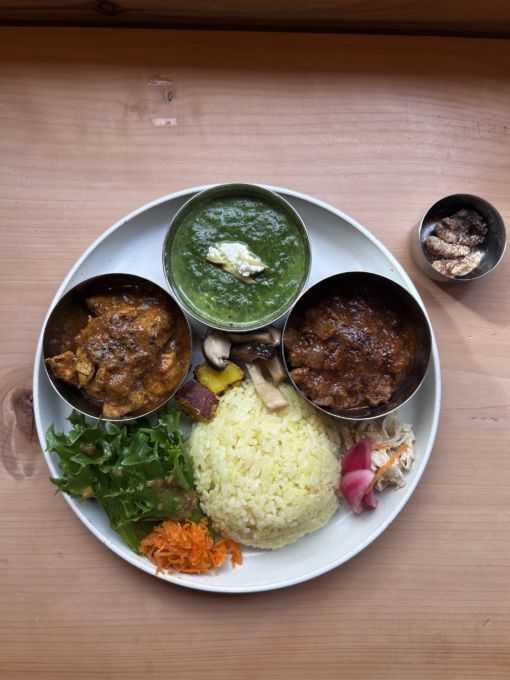 今日は「いつものチキンカレー」「ポークビンダルー」「ほうれん草とパニール」の3種盛り(1,600円、1種盛り1,200円、2種盛り1,400円)をいただきました 。