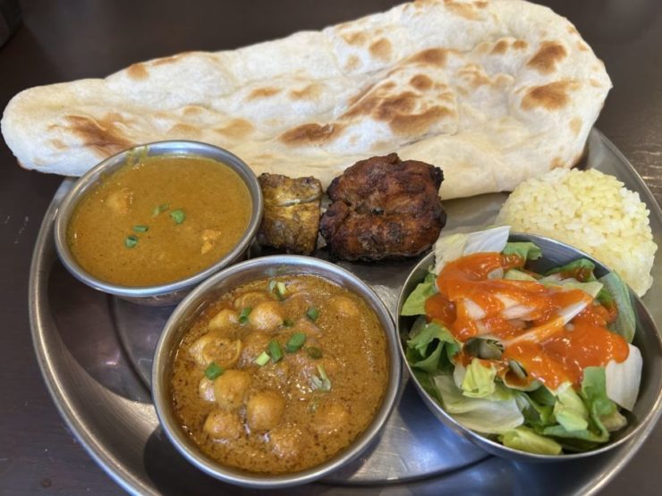 本日いただいたのは、2種類のカレーと2種類のタンドール料理(壺窯型オーブンで調理された料理)が選べる「スペシャルランチ」(1,450円)です。サラダが付くカレー単品のAランチ《チキンカレー・野菜カレー・チャナカレー(ひよこ豆のカレー)(820円)〉とBランチ《チキンティッカマサラ(骨なしチキン)・キーママタル(挽き肉とグリンピース)・マトンカレー・プローンカレー(エビのカレー)(920円)〉からそれぞれ一つを選びます。私は特別に、私の好みで「チキンカレー」と「チャナカレー」をいただきました。